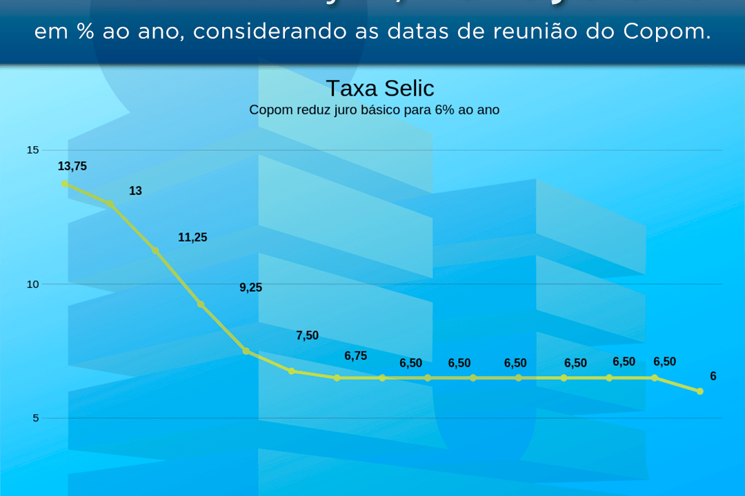 Na última reunião realizada, o Copom cortou a Selic de 6% para 5,5% ao ano, o que ajuda a diminuir os juros do financiamento imobiliário.